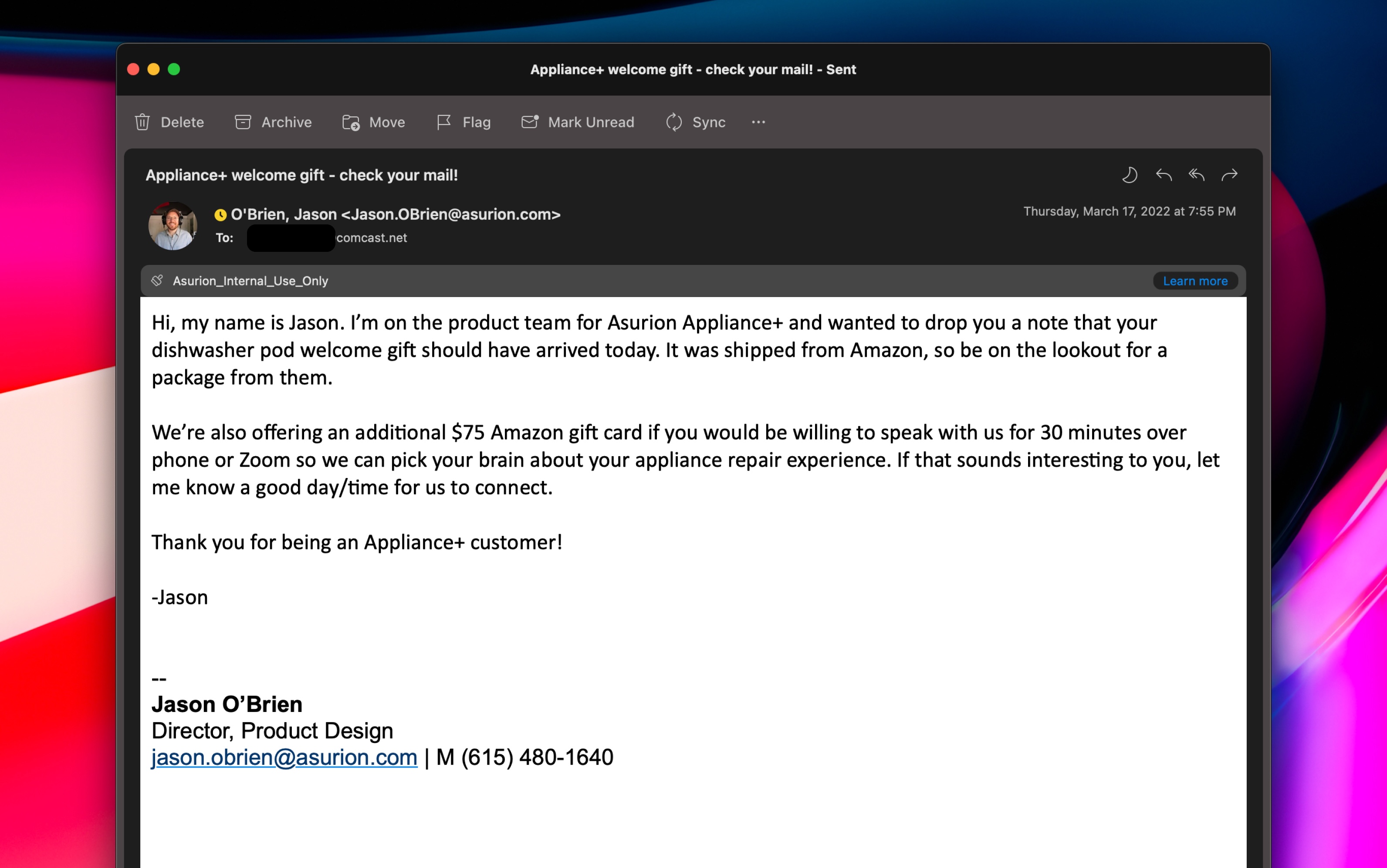 To quickly fulfill the welcome gifts, we set up a Typeform survey and hit the field to discuss this pilot with field experts. They loved the idea for several reasons, including having a single packet to hold all the documentation, and any additional incentive they could offer to get customers interested in Appliance+ was a win in their book.
